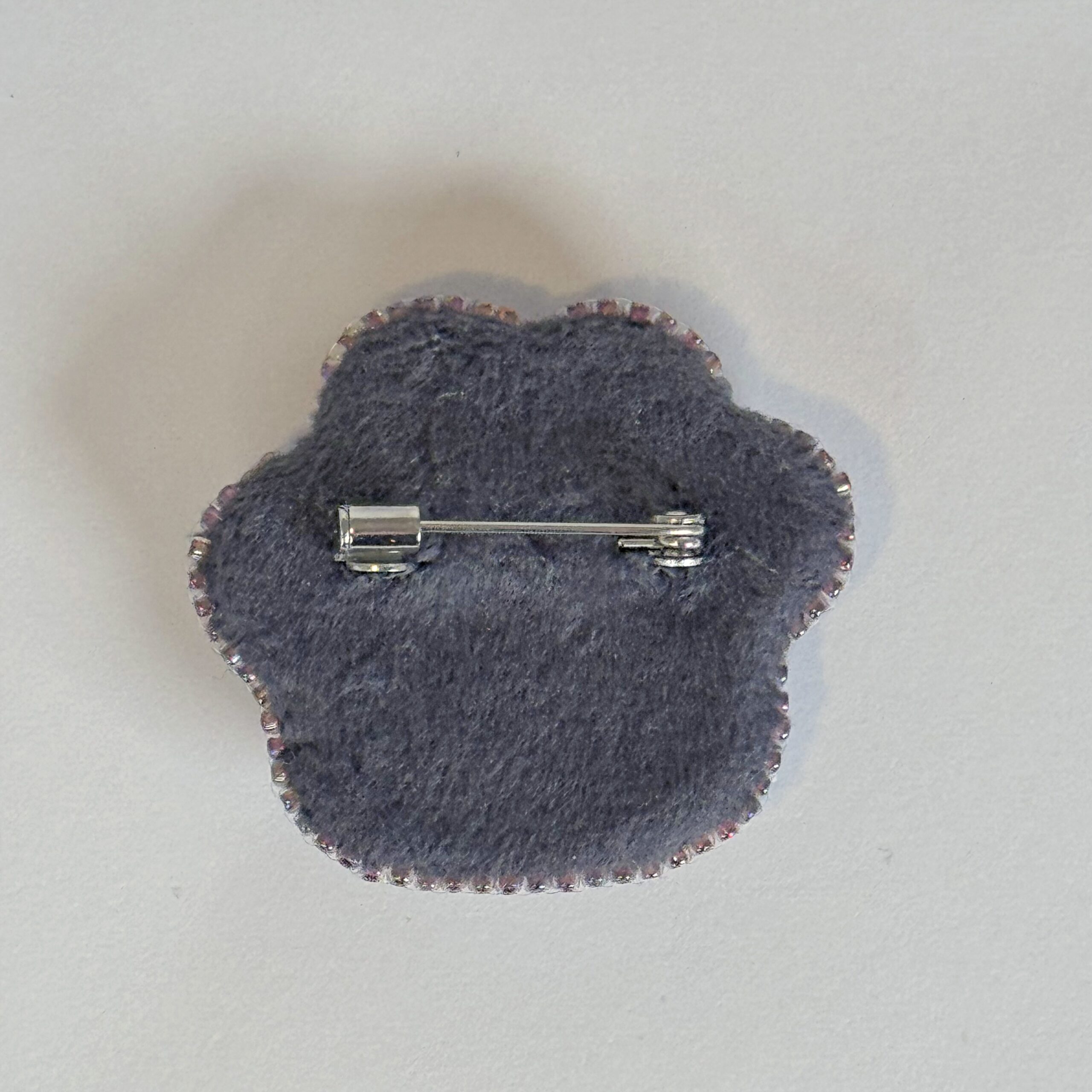 A sweet, tactile tribute to our beloved animal companions — this handcrafted paw print brooch is worked in a sophisticated grey and blush pink palette. The four toe pads are formed from lustrous grey pearl beads that have a beautiful, organic sheen. The central paw pad features a charming cluster of rose and blush pink crystal beads in a soft, rosy arrangement. A border of silver seed beads frames the entire paw with a clean, polished edge.