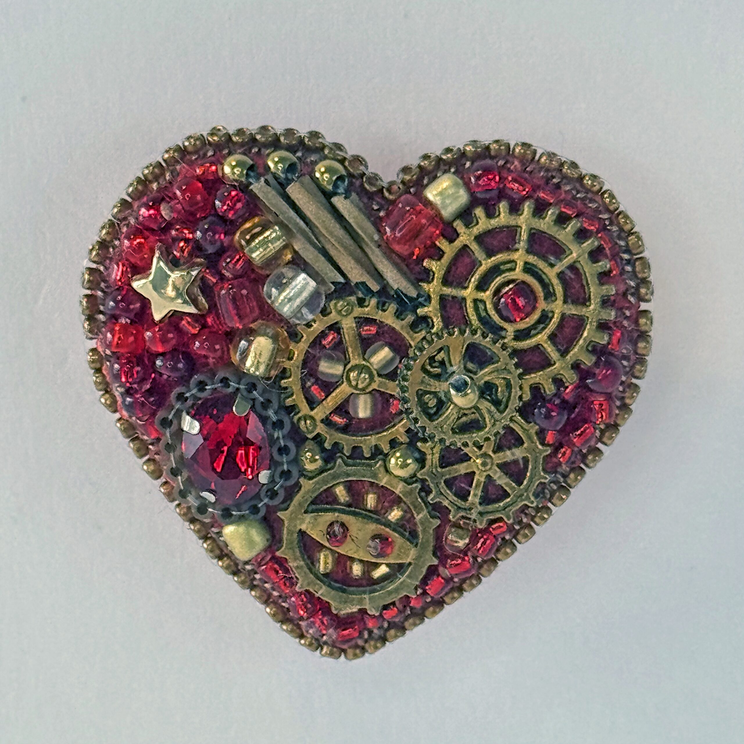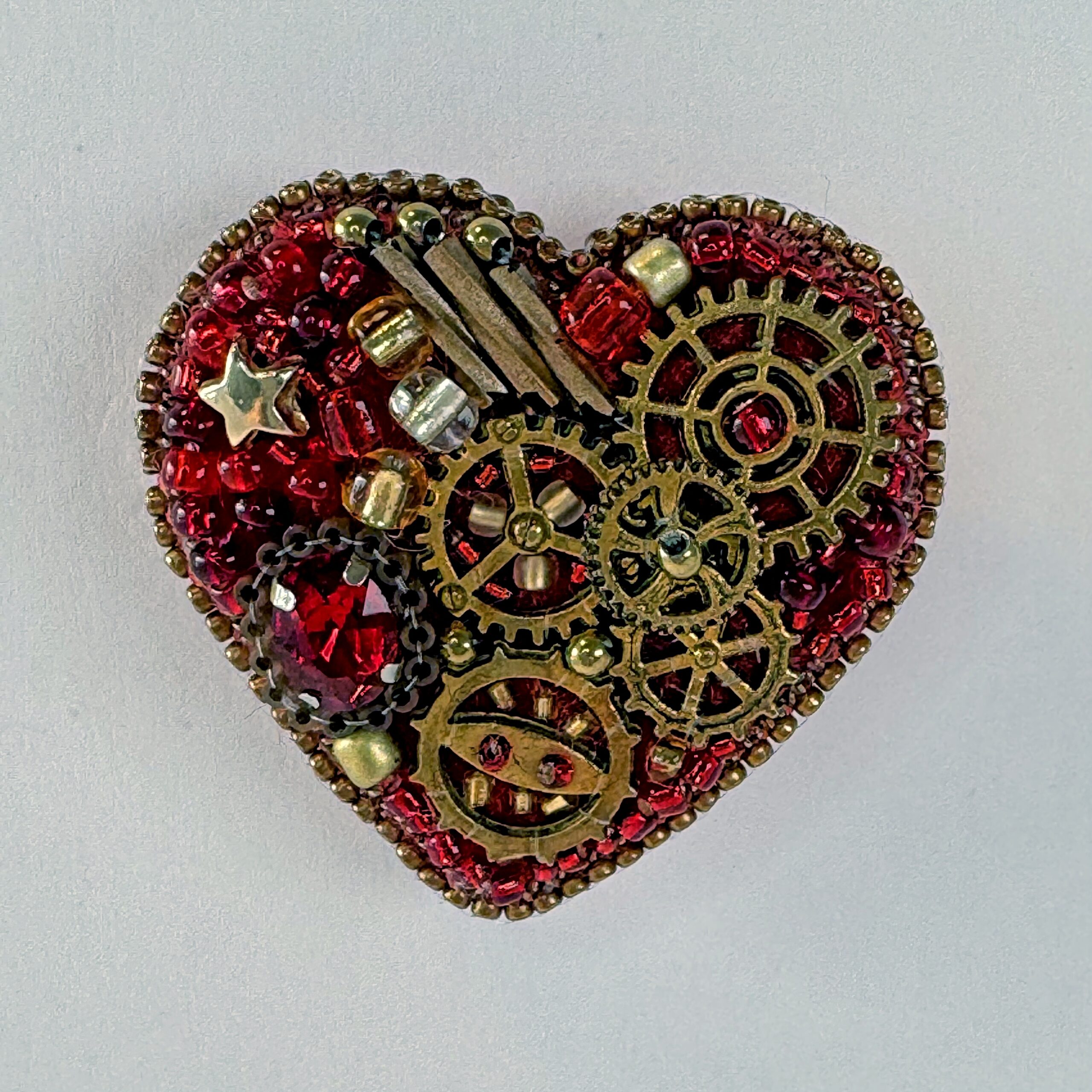 The most gem-accented of the steampunk hearts — this red mechanical heart combines bronze clock gears with a sparkling red faceted crystal, gold star beads, and red bugle bead background.