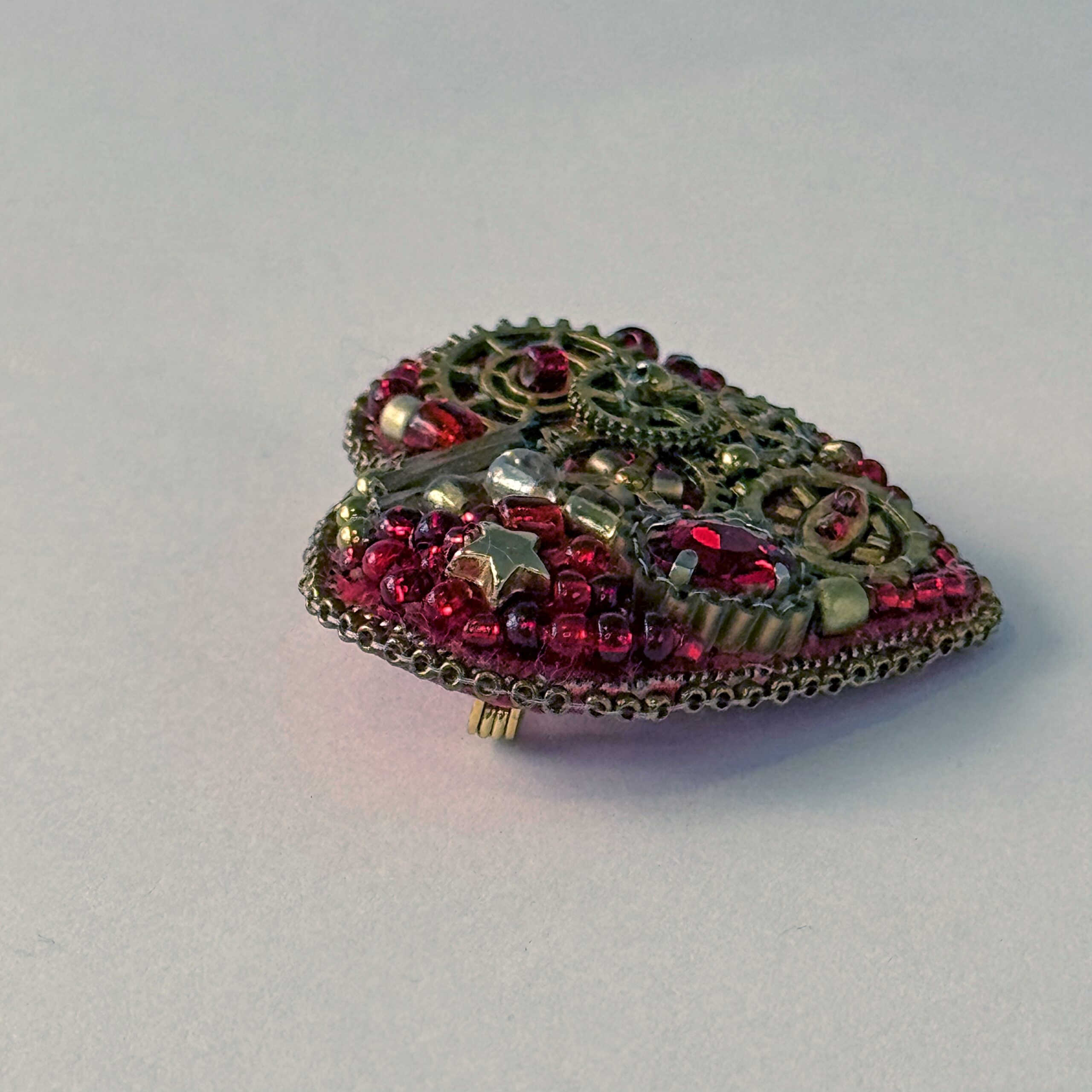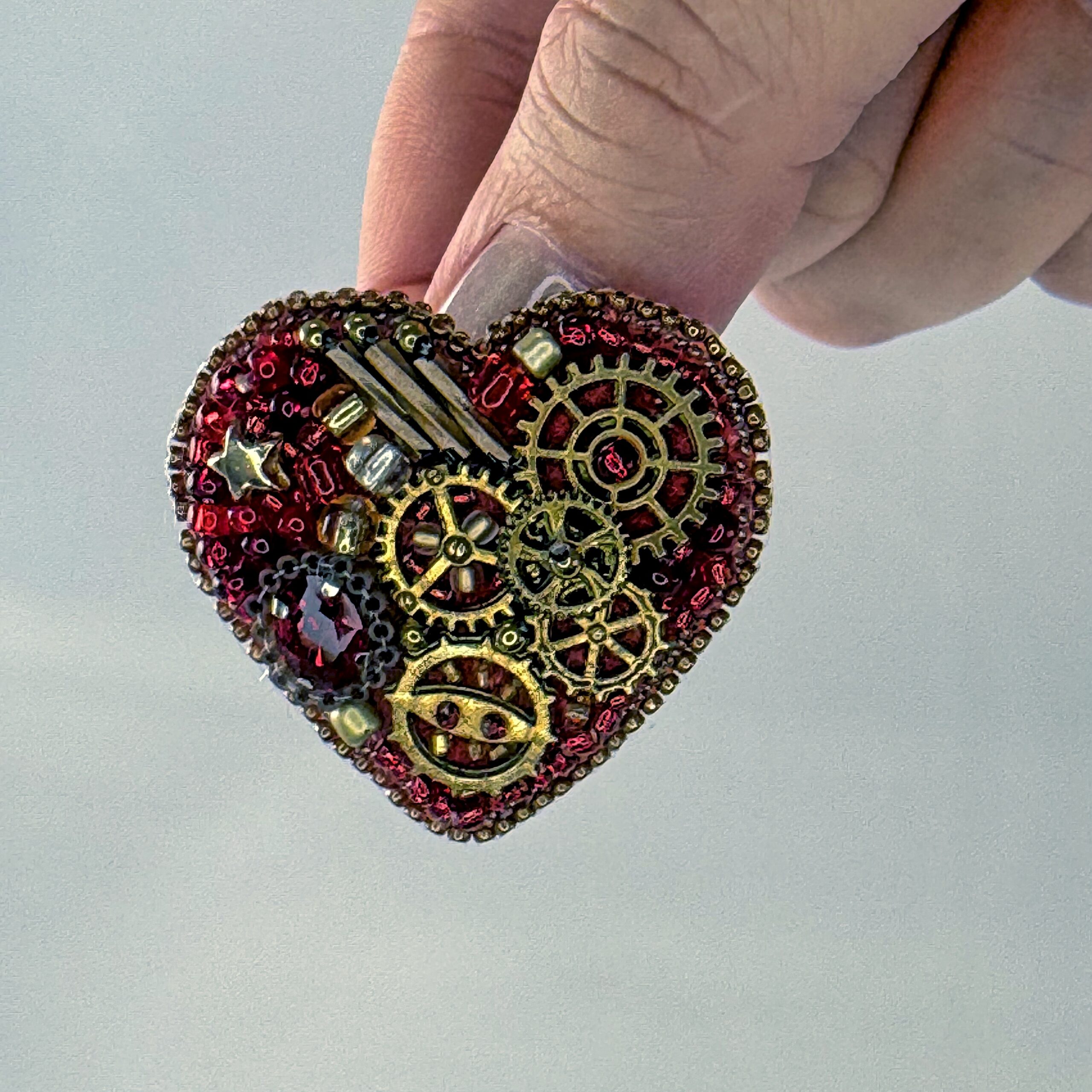 The most gem-accented of the steampunk hearts — this red mechanical heart combines bronze clock gears with a sparkling red faceted crystal, gold star beads, and red bugle bead background. The crystal adds a precious, sparkling dimension to the industrial gear composition, bridging the gap between Victorian clockwork and fine jewelry aesthetics. A complex and layered piece that rewards close inspection.